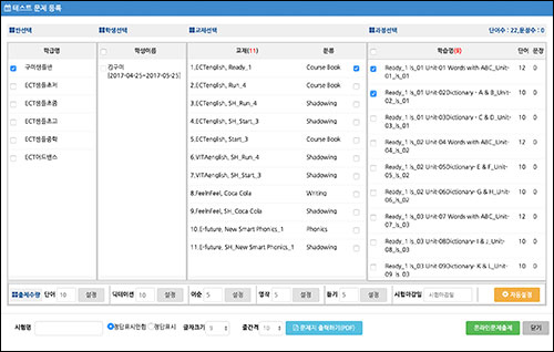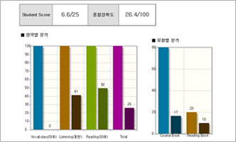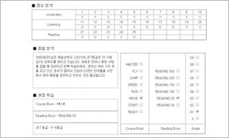 3단계(어휘, 듣기, 읽기)로 나누어진 간편한 레벨테스트 및 3개 유형의 결과표 산출로 유형별 맞춤 교재 선정